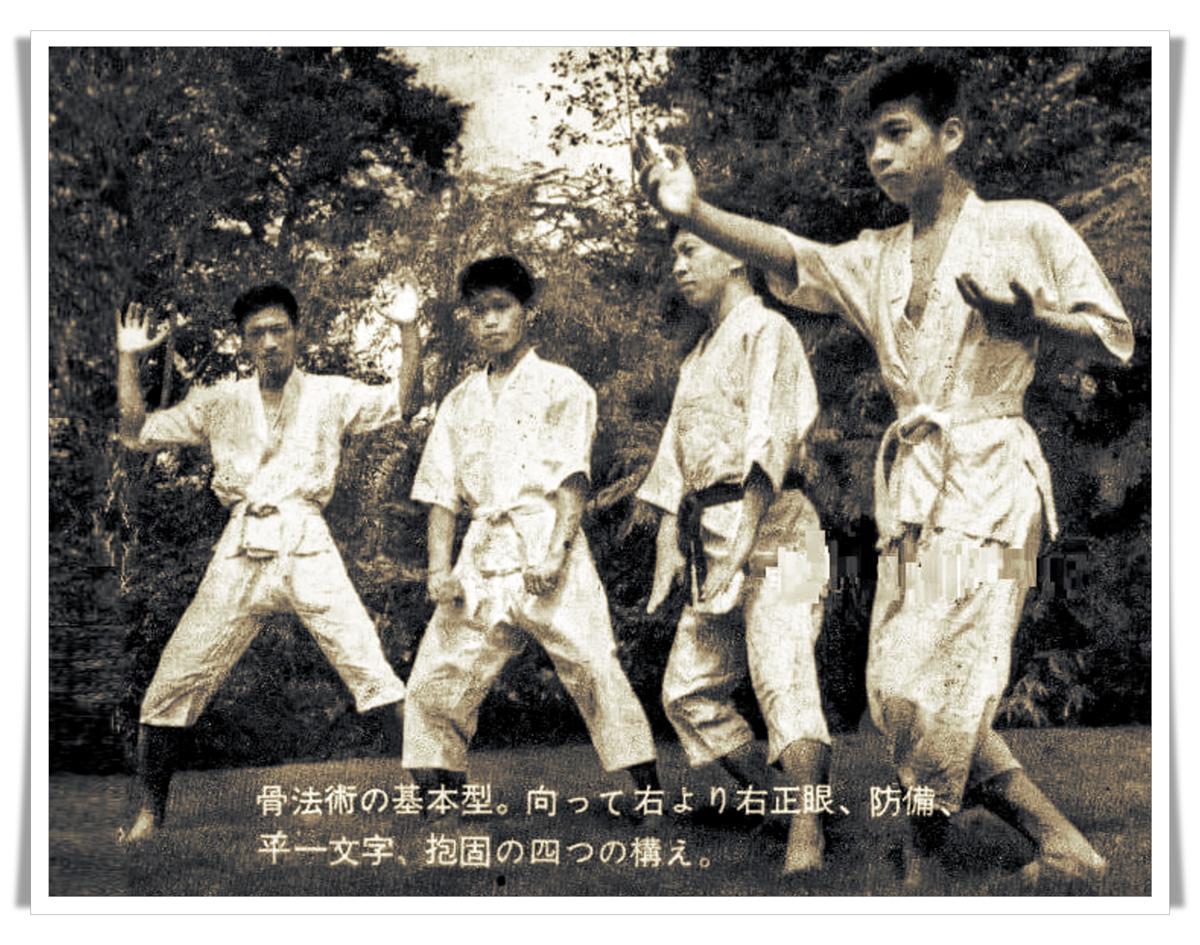 と書くごとく、骨法術の構は、虎倒流、義鑑流、玉心流、 雲隠流 おのおの位取りから構える姿精を大秘としている。口伝
